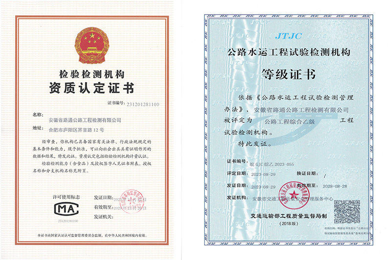 安徽省路通公路工程檢測有限公司成立于2003年7月?,F(xiàn)擁有公路工程綜合乙級(jí)檢測資質(zhì)、排水管道檢測及評(píng)估作業(yè)能力III級(jí)作業(yè)證書,并通過了檢驗(yàn)檢測機(jī)構(gòu)資質(zhì)認(rèn)定。2021年12月16日,獲批“高新技術(shù)企業(yè)”。各專業(yè)試驗(yàn)檢測人員配備齊全,具備開展集料、鋼材、土工、瀝青及瀝青混合料、水泥及水泥混凝土、砂漿、無機(jī)結(jié)合料、水、外加劑、磚以及路基路面、混凝土結(jié)構(gòu)物、基坑地基與基樁、橋梁結(jié)構(gòu)、交安設(shè)施、公路與橋梁技術(shù)狀況和城鎮(zhèn)排水管道檢測等多項(xiàng)試驗(yàn)檢測的能力。