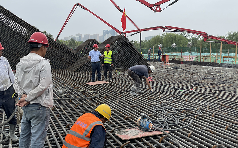 據(jù)悉,廣德路跨南淝河橋的關(guān)鍵節(jié)點(diǎn)主橋8號(hào)承臺(tái),采用不規(guī)格的矩形切角型,其承臺(tái)下設(shè)46根鉆孔灌注樁基礎(chǔ),設(shè)計(jì)總砼澆筑方量8869.2m3,本次澆筑方量4198m3。因整體澆筑體量大、技術(shù)要求標(biāo)準(zhǔn)高,為保障工程質(zhì)量,項(xiàng)目部精心組織、科學(xué)謀劃,編制《大體積混凝土專(zhuān)項(xiàng)施工方案》并經(jīng)專(zhuān)家多次研討論證通過(guò)。澆筑前項(xiàng)目部全力協(xié)調(diào)人、材、機(jī)配給,對(duì)現(xiàn)場(chǎng)安全施工標(biāo)準(zhǔn)、鋼筋制作綁扎、預(yù)埋件及冷卻管布設(shè)、施工及養(yǎng)護(hù)措施等進(jìn)行了詳細(xì)技術(shù)交底,將任務(wù)分解到人,責(zé)任落實(shí)到人,扎實(shí)做好各項(xiàng)準(zhǔn)備工作,以確保澆筑工作萬(wàn)無(wú)一失。