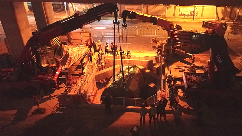吊裝方案經(jīng)多次比選、充分論證和現(xiàn)場(chǎng)核查,最終采用三臺(tái)折臂吊車(chē),進(jìn)行三次接力吊裝的方式,將頂管機(jī)從井中提升至運(yùn)輸車(chē)輛,完成吊裝作業(yè)。