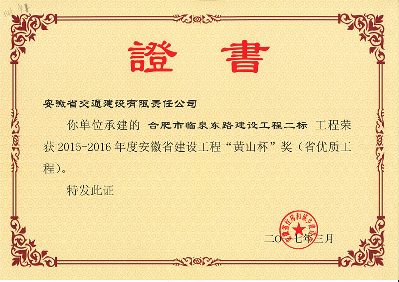 安徽省建設(shè)工程“黃山杯”獎是安徽省建筑行業(yè)建設(shè)工程質(zhì)量的最高榮譽(yù)獎,黃山杯的評選對象為安徽省建筑施工企業(yè)在中國境內(nèi)承包、已經(jīng)建成并投入使用的各類工程,工程質(zhì)量標(biāo)準(zhǔn)需達(dá)到省內(nèi)一流水平。安徽交建自成立以來,積極調(diào)整發(fā)展思路,不斷加快市場開拓步伐,重點(diǎn)強(qiáng)化項(xiàng)目管理全過程控制,做好工程進(jìn)度、質(zhì)量、安全和現(xiàn)場文明施工管理,營造了良好的企業(yè)形象。
