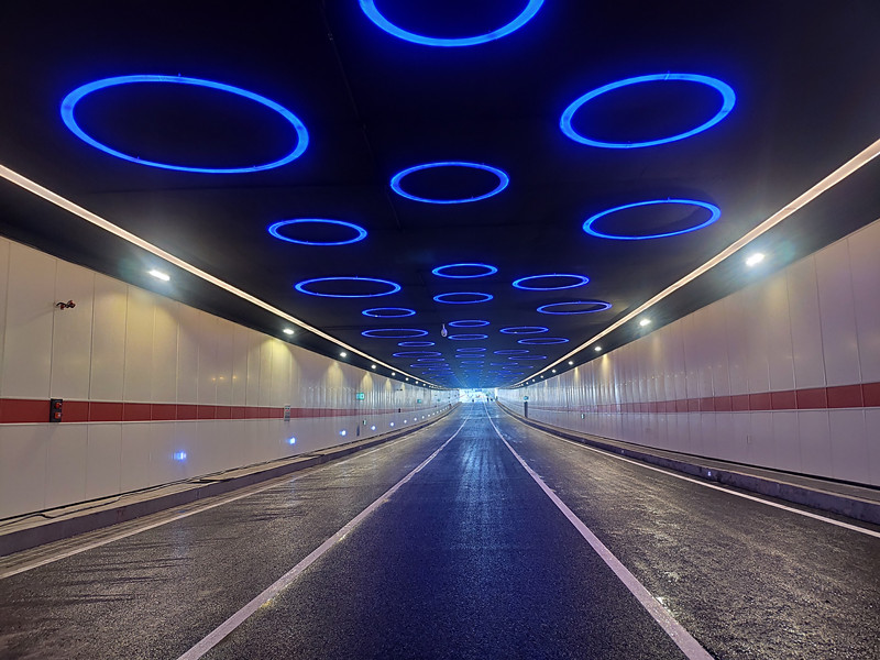在隧道裝修方面,入口設(shè)置形如天鵝展翅遮光棚,改善進(jìn)出隧道行車視線;隧道內(nèi)白墻黑頂,紅色腰線伸向遠(yuǎn)處,內(nèi)頂鑲嵌圓形LED燈飾,如湖底映射的一個(gè)個(gè)藍(lán)色漣漪。
